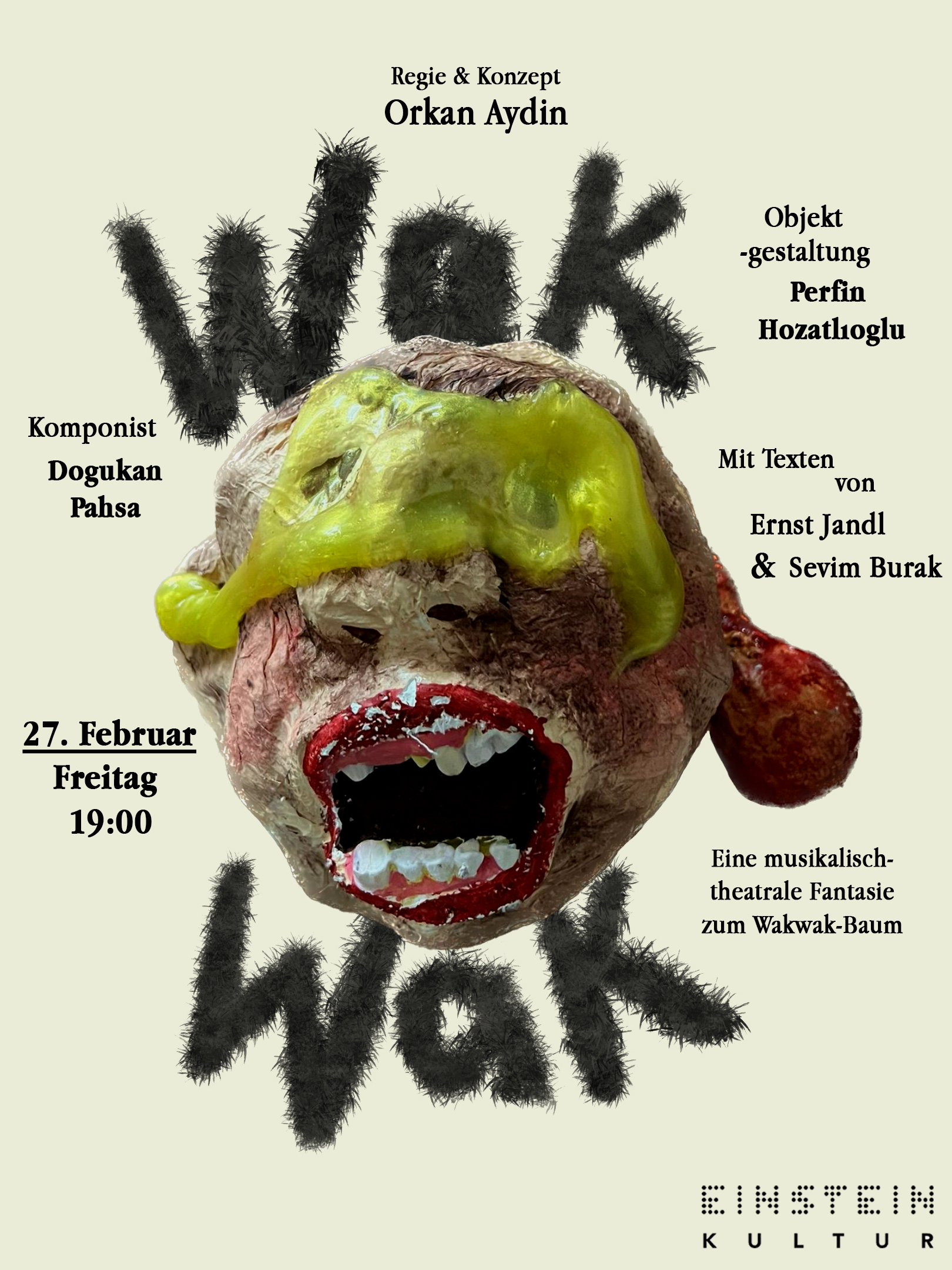 In der Textfassung erscheint Ernst Jandls „Die Humanisten“ als satirischer Einspruch gegen eine westlich-aufklärerische, kolonial geprägte Vernunftlogik, die im Stück auf die tricksterhafte und eigensinnige Natur des Baums trifft. Ergänzt wird dies durch Passagen aus Sevim Buraks „Everest My Lord“, deren fragmentarische Sprache eine spekulative historische Realität entwirft und die rätselhafte, vieldeutige Dimension des Wakwak-Mythos weiter vertieft.
